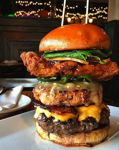 You see what it is: a massive beef patty plus a smoky ground pork and beef patty that’s topped with maple-bourbon fried chicken – with pickled jalapeňos, pepper-Jack cheese, ranch, lettuce, tomato and pickles!